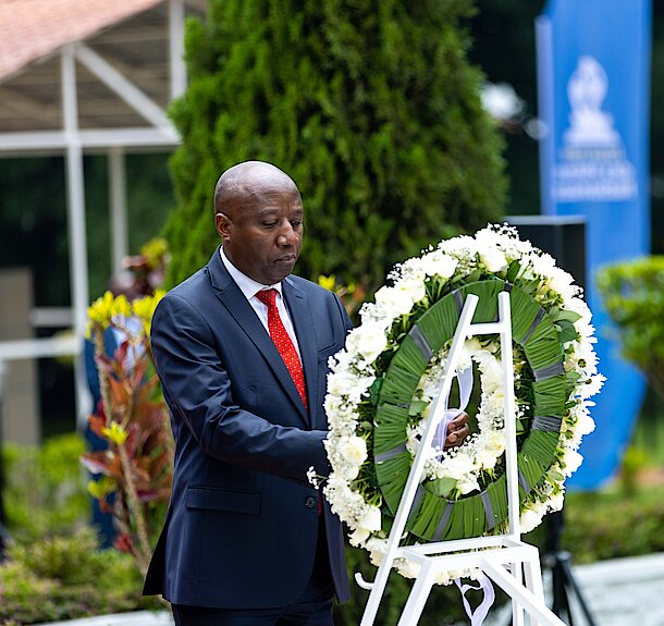 In a ceremony that took place at the National Heroes Mausoleum located in Remera, City of Kigali, Prime Minister laid a wreath on the symbol of heroes as a tribute to Rwandan Heroes who have displayed exceptional patriotism and sacrifice for the Country.